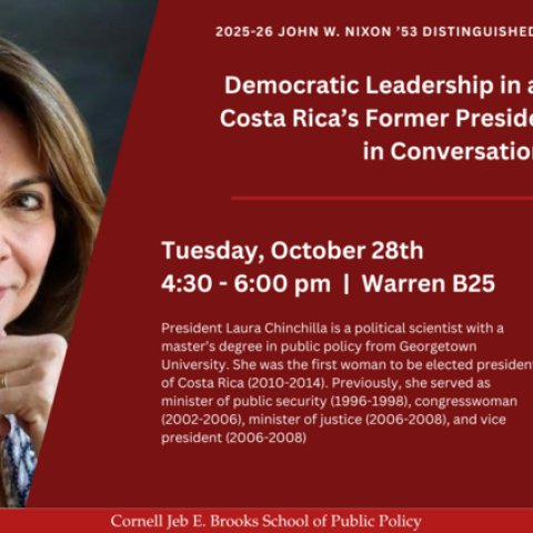 You are warmly invited to join us for a special event with President Laura Chinchilla, 2025-2026 John W. Nixon ’53 Distinguished Policy Fellow, in conversation with Professor Rachel Riedl, Peggy J.